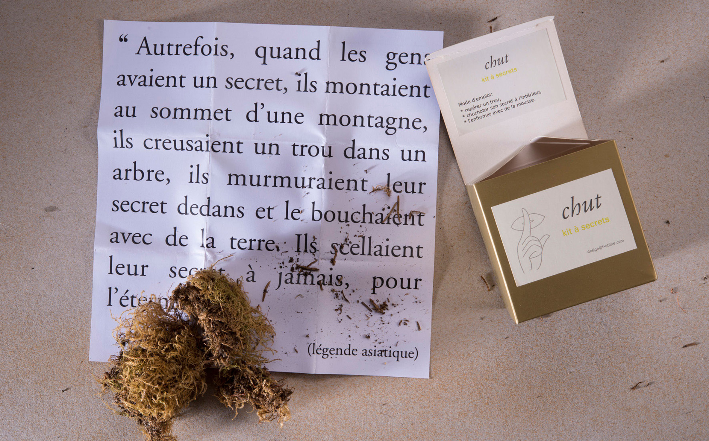 Basé sur une légende asiatique, ce kit permet de se libérer d’un secret en le chuchotant et en l’enfermant dans un trou grâce à de la mousse végétale. Ce kit à secrets contient un relevé topographique de trous naturels (et à portée d’Homme) d’un quartier utopique à s’approprier, un sachet de mousse végétale et le texte source en question.