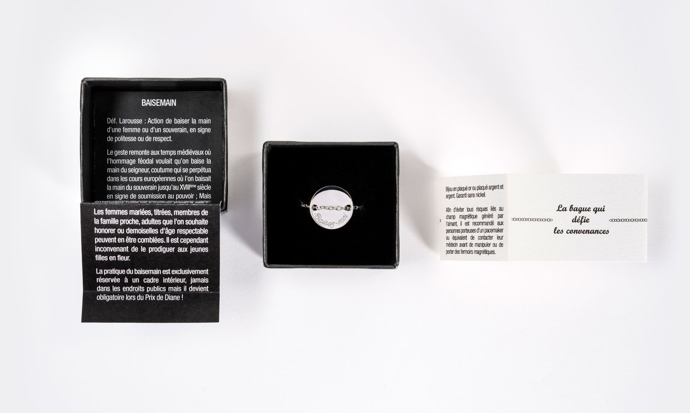 Elle se veut atypique car dotée d’un fermoir aimanté et accompagnée, dans son écrin, de l’histoire du baisemain afin de rappeler les bonnes manières.