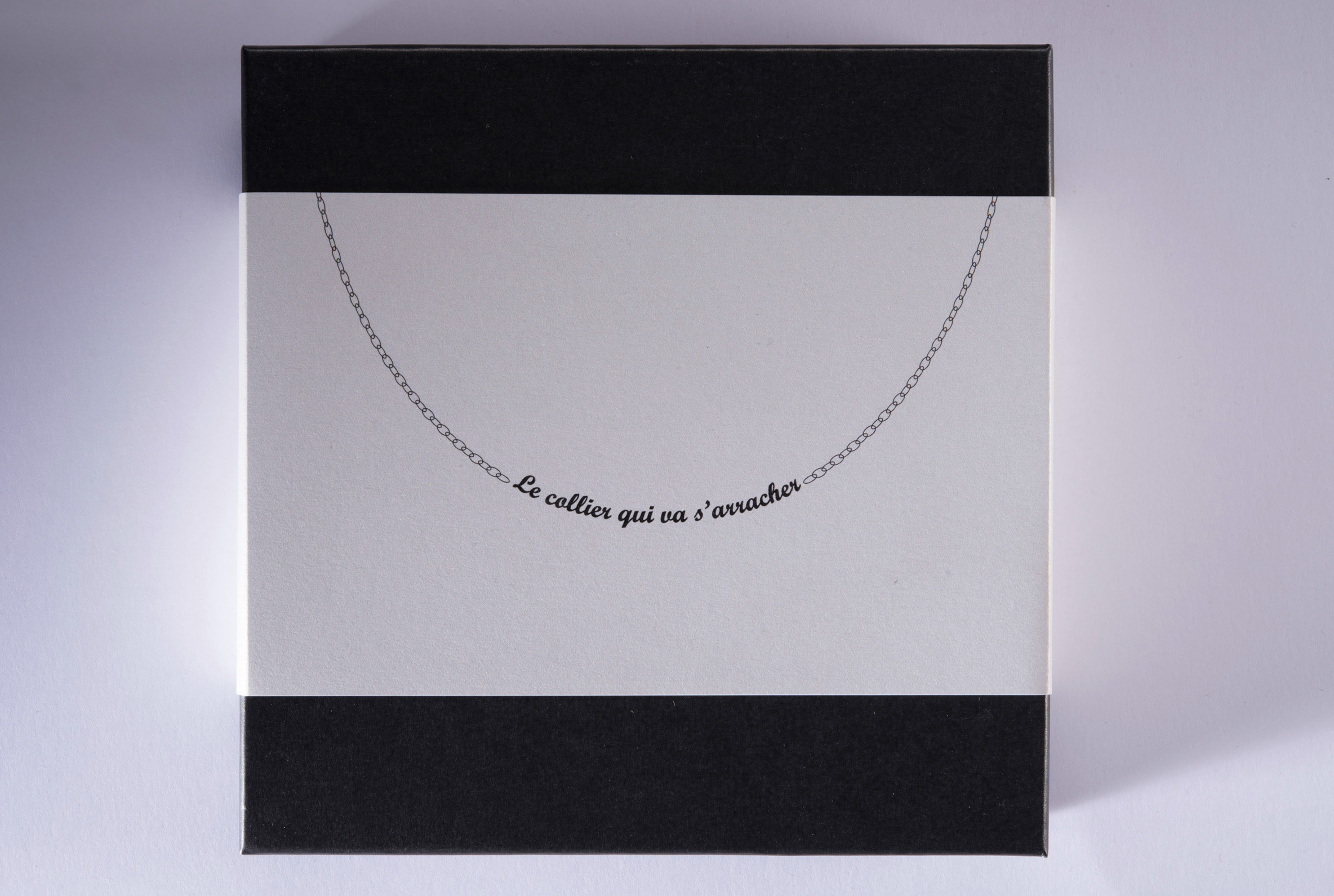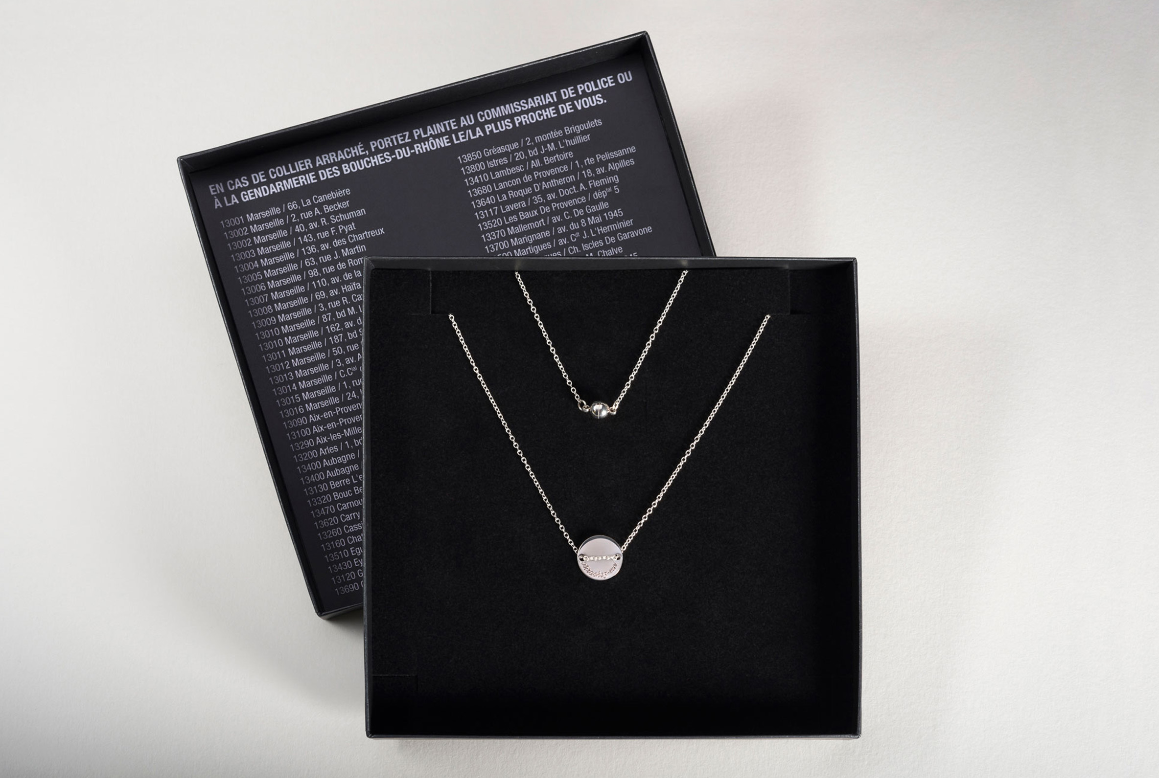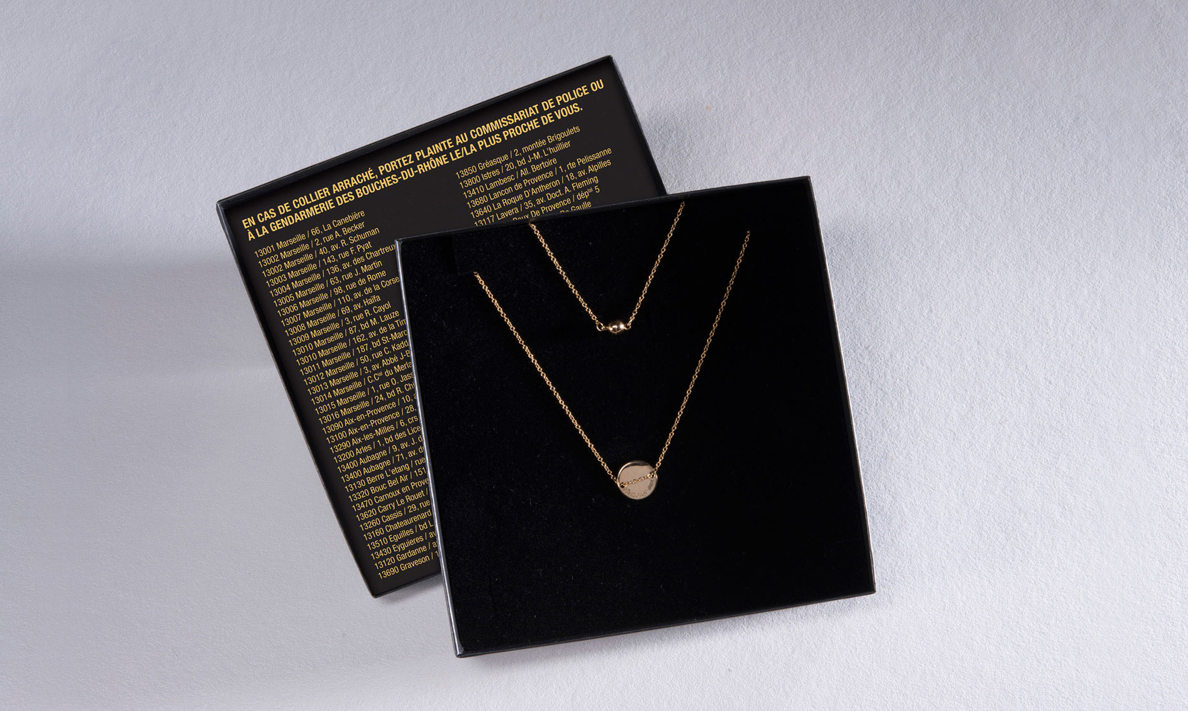 En guise de pied de nez au vol de bijoux à l’arraché, «le collier qui va s’arracher» est en plaqué or ou plaqué argent et gravé des mots «Arrachez-moi» sur le pendentif. Il se veut provocateur car pourvu notamment d’un fermoir aimanté et d’une liste des commissariats de police et gendarmerie environnants* fournie dans l’écrin, afin de déposer plainte au plus vite… *(différentes villes/régions disponibles)