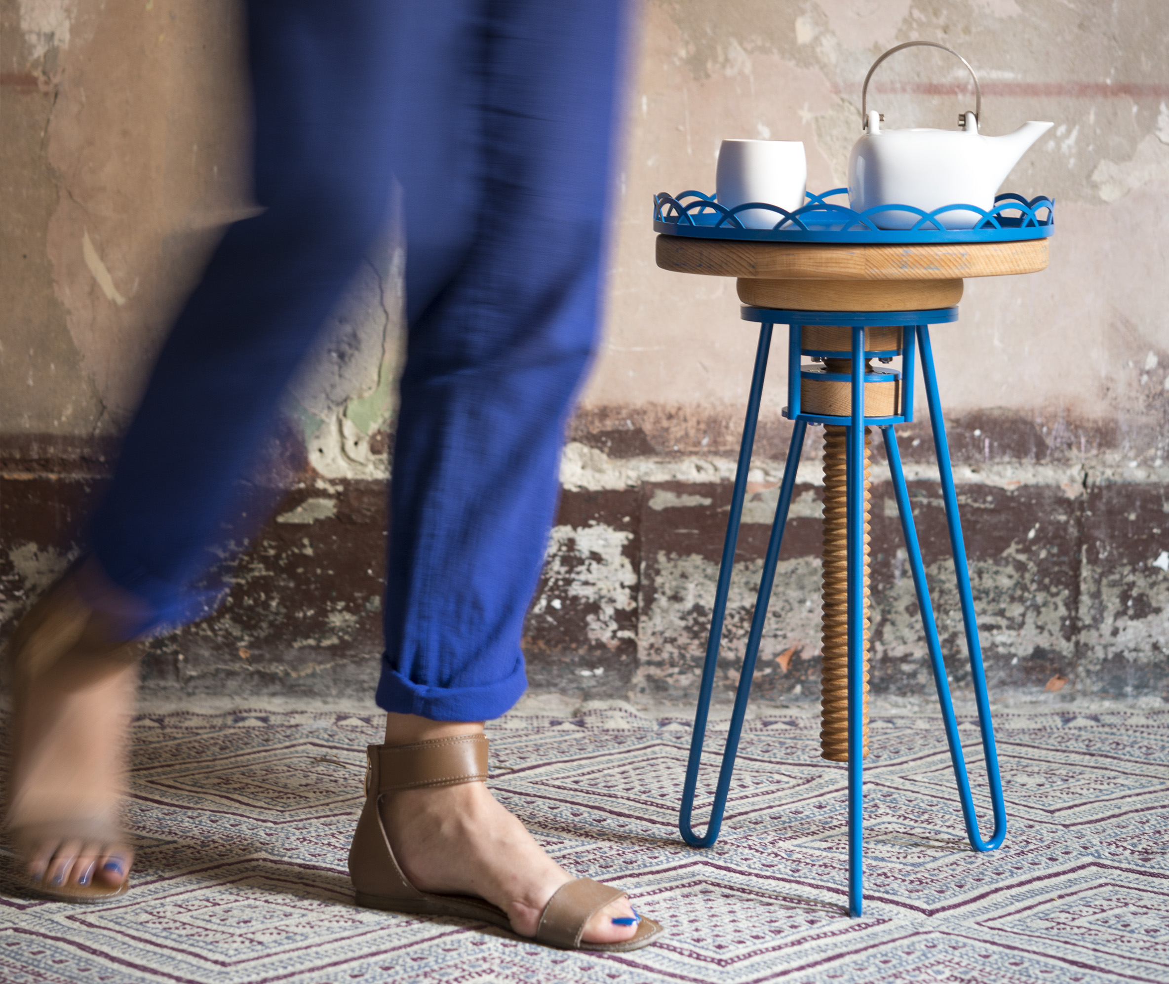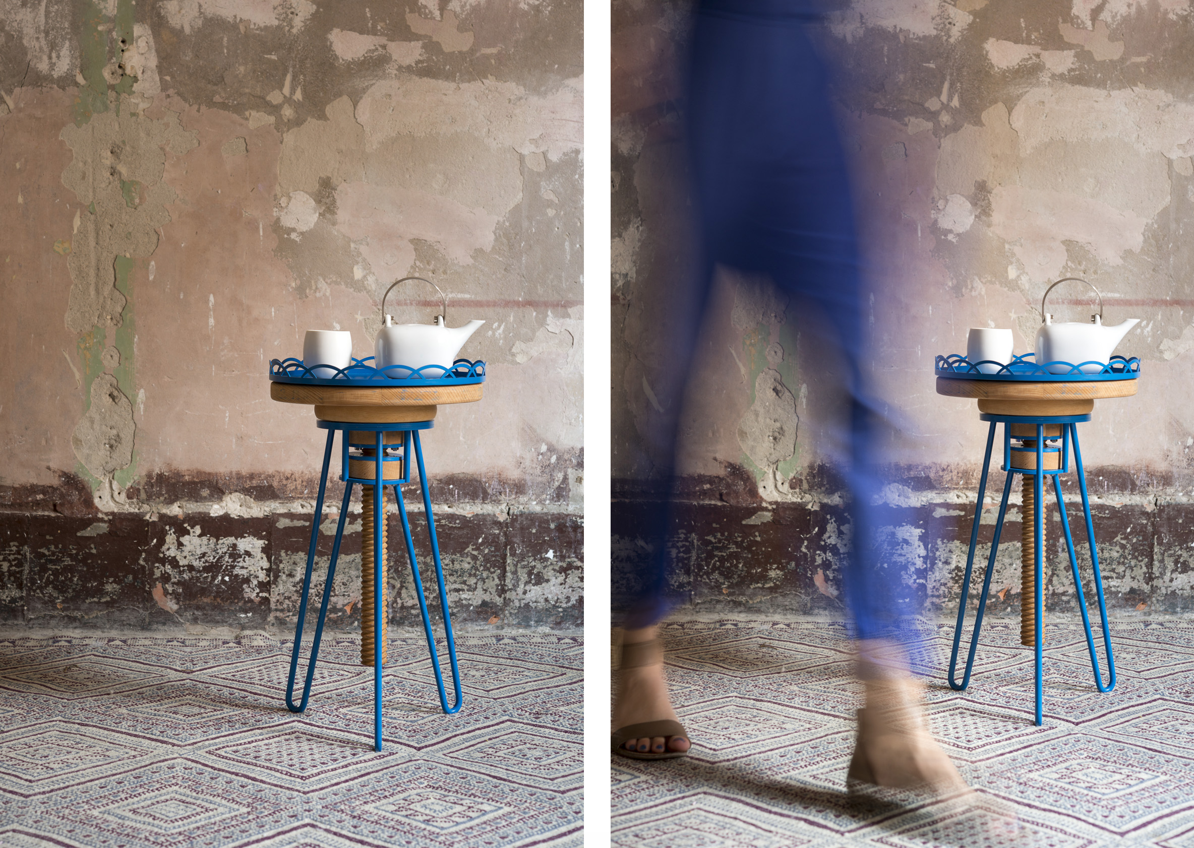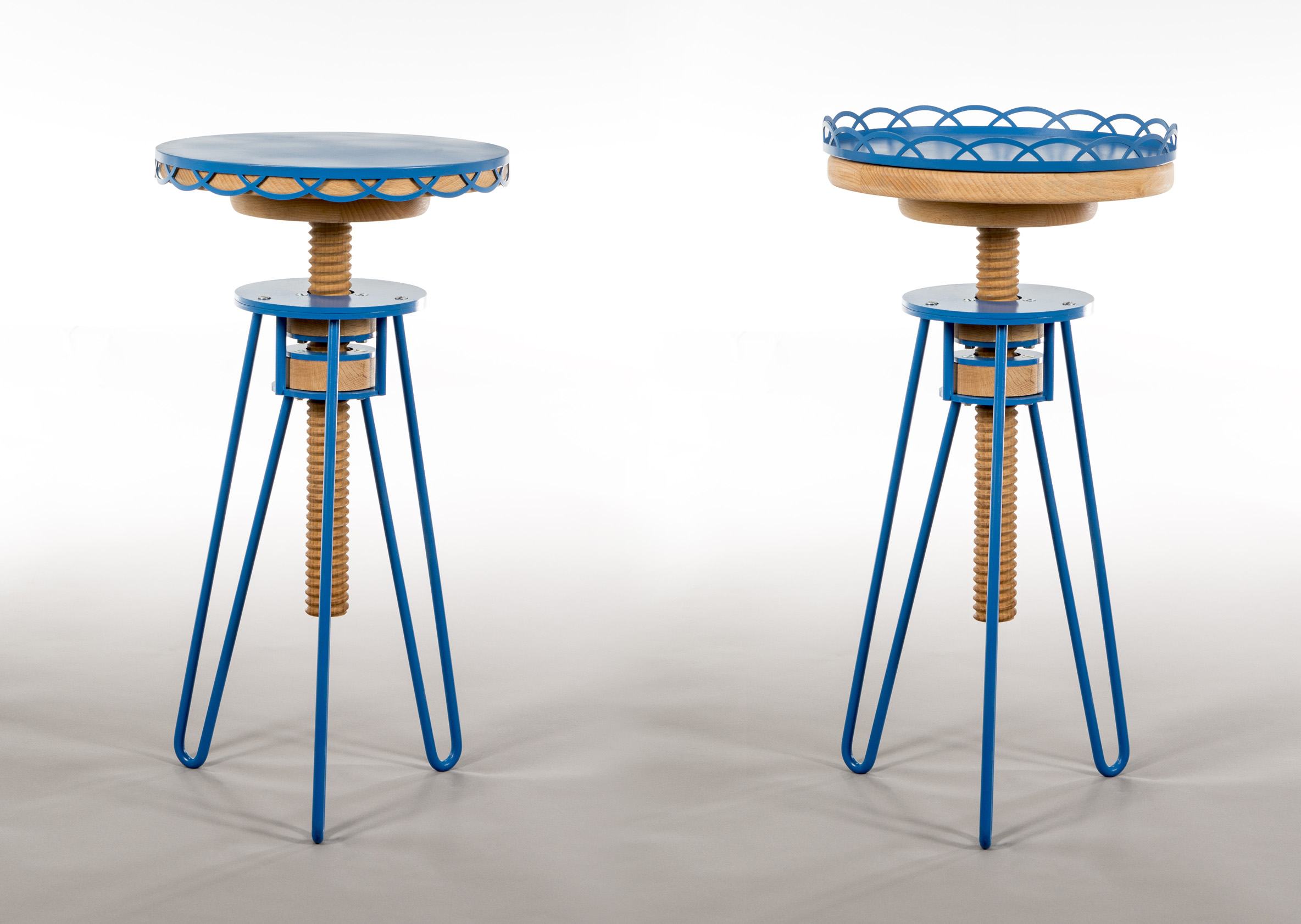 Tel un fantôme du tabouret en bois réglable en hauteur que nous avons tous eu chez nous, «Upside down» le revisite en y intégrant un plateau en métal aimanté, aux motifs-dentelle rappelant les pieds, épousant la forme de l’assise dans un sens et offrant un plateau dans l’autre.